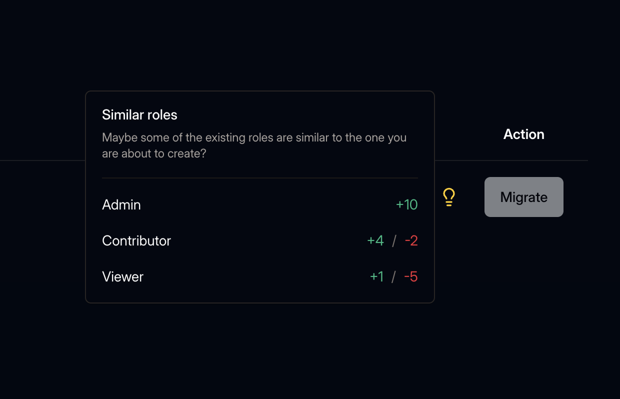 For an even smoother transition, we have introduced Role Suggestions. Simply hover over the 💡 icon to view a list of suggested roles along with their permission variances.